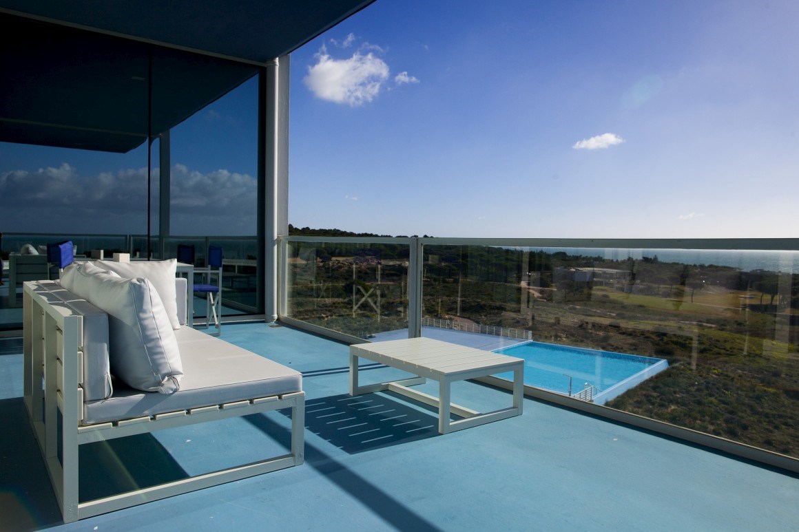 Todas as decisões foram tomadas em família, continua, em colaboração com o arquitecto José Anahory — a enorme estátua colocada no exterior, que acolhe os clientes, bem como as pequenas que servem de apontamento em cada piso e os quadros são todos deste arquitecto, escultor e artista. Foi em conjunto que decidiram como seria este projecto: completamente integrado na natureza, vidros enormes em vez de paredes para que tudo se possa ver, as dunas, o golfe, o mar, as casas vizinhas, a luz, o sol que se reflecte na água ao final do dia.