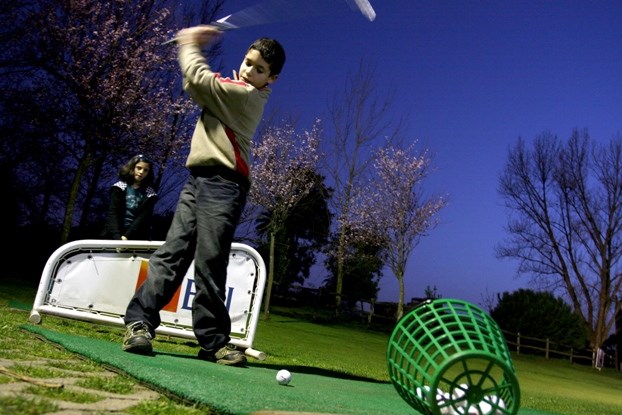 Gostava de ser jogador de golfe? "Se calhar... não sei. Gosto de estar aqui ao ar livre." Praticante "de futebol [Vitória de Setúbal] e piscina", o rapaz estreou-se no campo de golfe este ano, embora tenha em casa um "set, com um pequeno relvado e uns tacos", explica o pai, que veio até aqui de bicicleta com o filho. A conversa é interrompida. "Pai, passei dos 100 com uma tacada muito alta." O pai: "Boa!" O professor: "Este miúdo quase não falhou uma clínica."