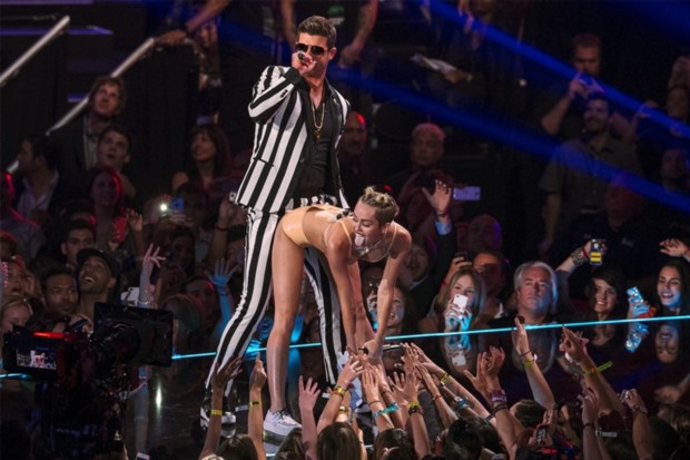 A ex-Hanna Montana já tinha rapado o cabelo – Britney fê-lo em 2007 – e adoptado um look mais rebelde – algo que Christina fez logo nem 2002 com Dirrty-, mas no domingo sacou de todos os seus trunfos para mostrar que Hanna Montana já era. Quando subiu ao palco para a performance do tema We can’t stop podia estar acompanhada por ursinhos, mas o seu alvo não era o público juvenil. De bustier e calções em tom de pele, a sensualidade atingiu um novo mínimo quando Cyrus acompanhou Robin Thicke no tema Blured Lines – de língua de fora, desceu até ao chão mostrando o significado de “drop it low”.
