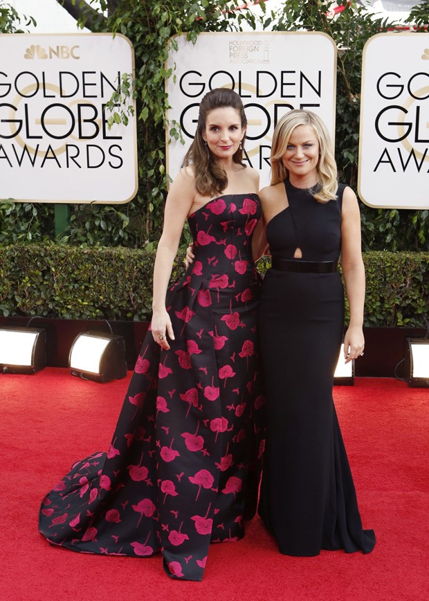 - As anfitriãs da cerimónia, Tina Fey em Carolina Herrera e Amy Poehler em Stella McCartney