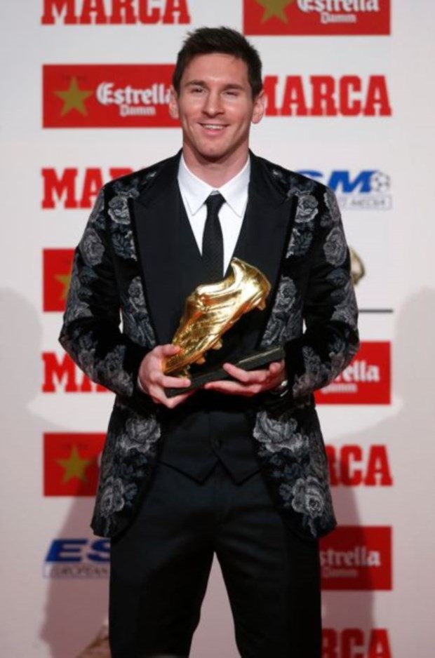 Passando para as galas desportivas, é quase de rezar para que Messi não seja galardoado. Felizmente para os que gostam de desporto, mas infelizmente para os que não são cegos, o jogador passa a vida a ganhar prémios. Bota de Ouro 2012/2013: o troféu distinguiu o argentino como melhor marcador nas ligas europeias, com 46 golos apontados em 32 jogos no campeonato espanhol. Grande feito profissional, decorado com um blazer recheado de rosas prateadas, que em conjunto com o colete que veste por baixo do casaco cria a ilusão óptica da maior lapela que o mundo já viu. O padrão, para alegria dos que são de estômago fraco, não continua pelas calças.