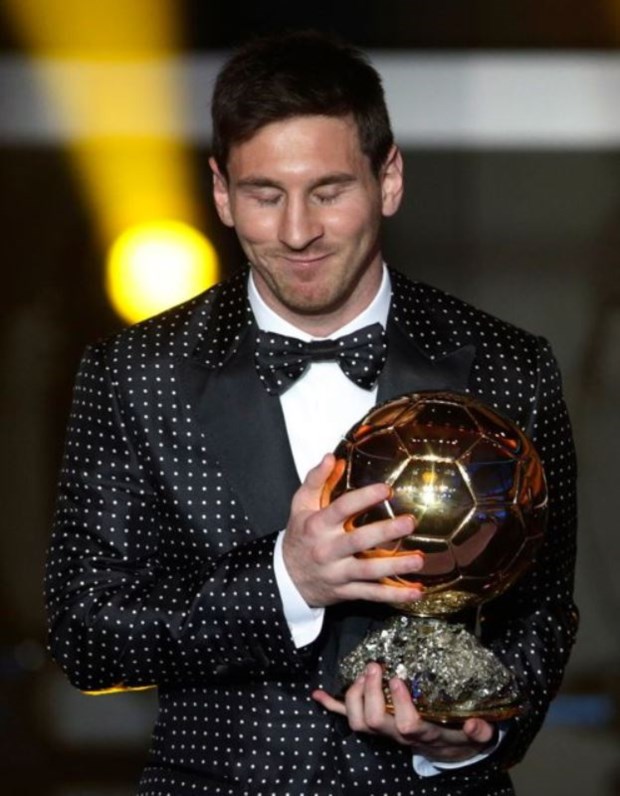 E, para acabar a lista dos seus crimes de moda, o célebre smoking polkadot que Messi vestiu para aceitar a Bola de Ouro FIFA 2013. Completamente coberto de bolas pequenas e brancas, o mundo ficou espantado por ser a quarta vez consecutiva que o jogador ganha e por ser mais um fato impensável para qualquer cerimónia.