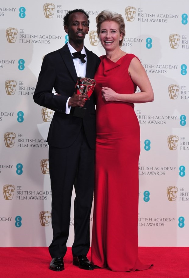 - Emma Thompson em Maria Grachvogel com sapatos Jimmy Choo ao lado de Barkhad Abdi Carl Court / AFP