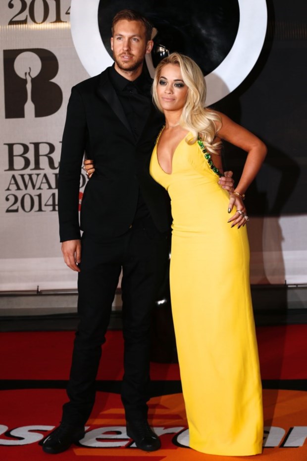 - Rita Ora num vestido Prada com Calvin Harris num fato Emporio Armani Andrew Cowie / AFP Photo