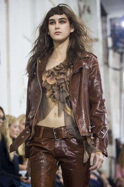 Do trabalho em brocados da estação passada que disseram, em Fevereiro, ser uma saída da sua zona de conforto, passaram para os tops com decotes halter com fivelas (em materiais como a camurça, chiffon e seda), às saias desconstruídas pelo tornozelo mas que se arrastam pelo chão, aos casacos com folhos volumosos, gabardines e blusões biker, e, claro, as gangas desfiadas – em calças à boca-de-sino, em crop tops, vestidos curtos, em casacos. A descontracção, a casualidade e o conforto continuam a fazer parte da colecção e da identidade da marca. Na paleta de cores, além do característico azul da ganga, há bege, vermelho, rosa forte (em blocos) e um padrão floral.