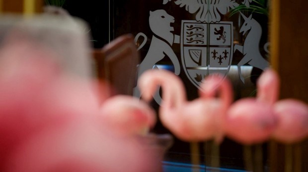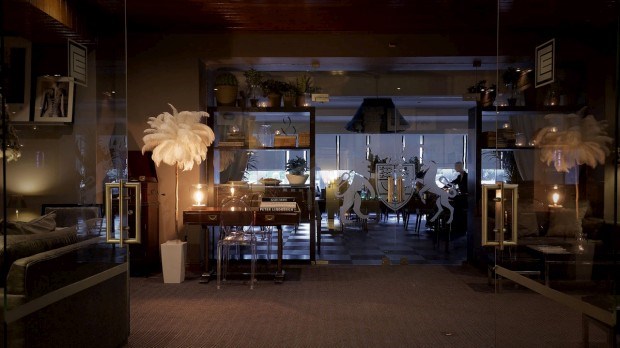O hall de entrada dá, desde logo, algumas dicas a quem quer que ali entre sobre a decoração dos restantes espaços do hotel. Ao fundo, de frente para a recepção, três saias tutu servem de candeeiros dispostos a diferentes alturas sobre uma mesa de vidro de onde – dos vasos dourados que estão sobre ela – saem plumas cor-de-rosa. Os sofás de veludo cinzento, os pássaros e flamingos de decoração e o busto de uma mulher são o ponto de partida para o estilo irreverente que Corinne Henriksson imprimiu neste espaço.
