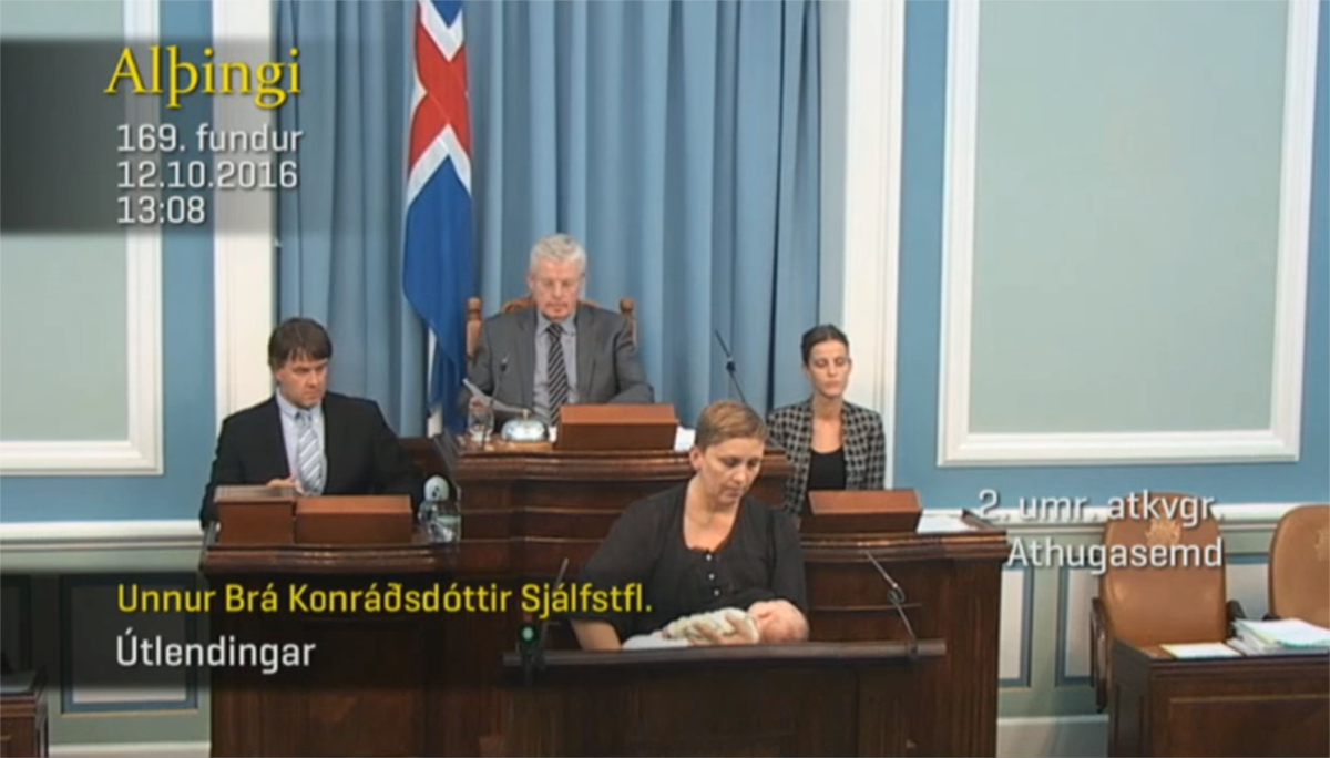 A deputada islandesa Unnur Bra Konradsdottir precisou de intervir no momento em que estava a amamentar a filha de seis semanas. E fê-lo.