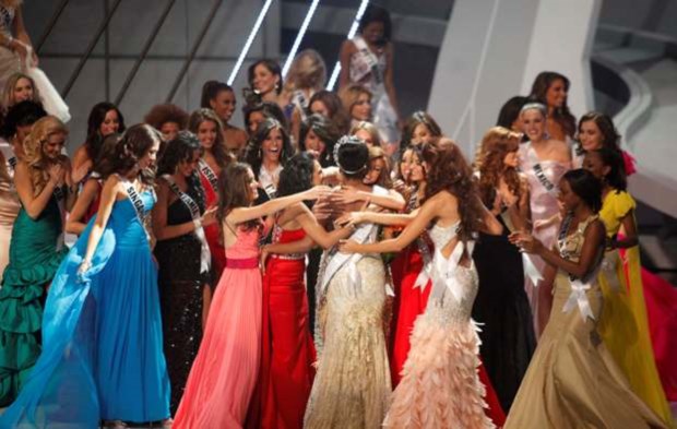 - A Miss Universo 2011 é felicitada pelas outras concorrentes Nacho Doce /REUTERS