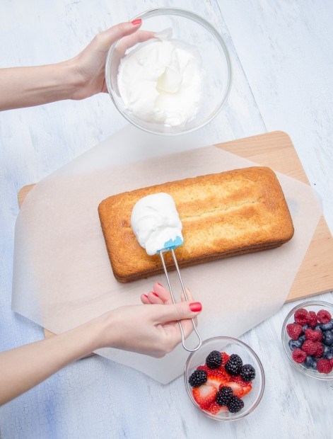 Chantilly: Bater as natas com o açúcar, colocar sobre o bolo e decorar com frutos silvestres.