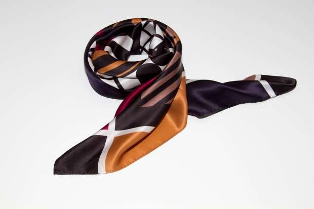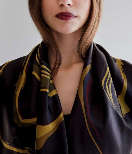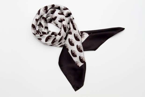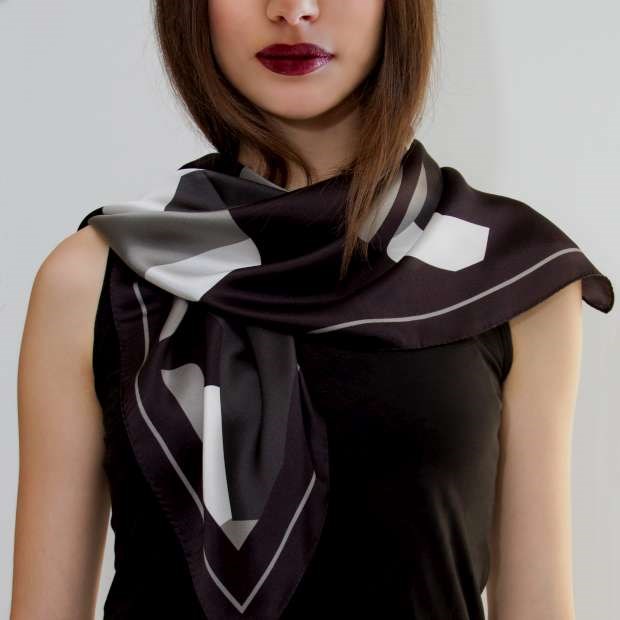 Colecção-cápsula tem 16 lenços em seda com geometrias e os seus tons negro, cinza e vermelho.