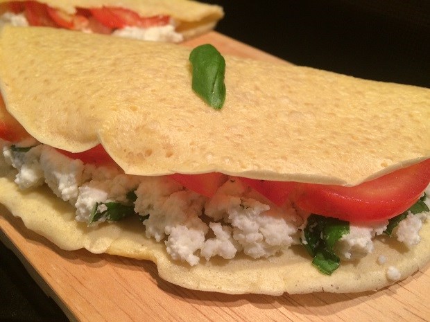 Numa tigela amassei o requeijão com algumas folhas de manjericão picadas. Recheei as crepiocas com esta mistura. Em cima, dispus tomate fatiado(que já tinha lavado).