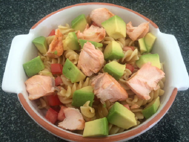 Temperei o salmão com umas gotas de sumo de limão (se desejar, pode também colocar alho picado, desta vez não usei). Cozi o fusilli em água abundante, escorri e reservei. Grelhei o salmão, deixei arrefecer ligeiramente e desfiz em lascas. Lavei o tomate, piquei-o e cortei metade de um abacate em pedaços. Adicionei o tomate, o abacate e o salmão lascado à massa, que temperei com o azeite e mais umas gotas de sumo de limão.