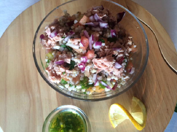 Cozi o trigo sarraceno na água com os 3 pés de salsa. Escorri o excesso de água e reservei até ficar frio. Entretanto lavei e piquei finamente o tomate, o pimento, a cebola e as ervas e escorri o atum. Envolvi tudo e preparei o molho: piquei o alho e o cebolinho e misturei com o azeite e o sumo de limão.