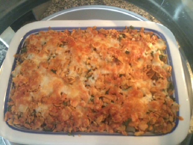Numa tigela misturei os flocos de milho (que esmaguei grosseiramente com as mãos), com a salsa picada. Num recipiente de ir ao forno coloquei o frango, os flocos de milho e, por cima o queijo ralado. Levei ao forno cerca de 10 minutos, a 200 graus, até estar dourado.