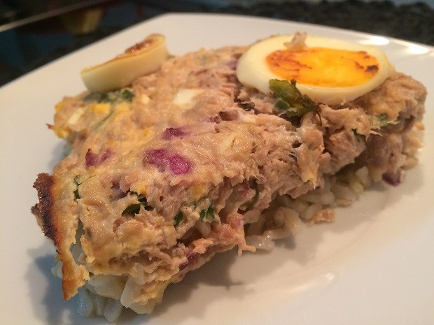 Deixei o arroz de molho durante a noite, escorri-o e cozi-o com o triplo da água e uma folha de louro. Cozi também um ovo, que cortei em fatias, das quais reservei 3 e as outras piquei. Escorri o iogurte e o atum. Numa tigela misturei o atum com o iogurte, a salsa, a cebola e o ovo picado. Se desejar, pode também colocar pimentos, desta vez eu não usei. Num recipiente que possa ir ao forno, que pré-aqueci a 220 graus, coloquei em baixo, 4 colheres de sopa de arroz e, por cima, a mistura de atum e iogurte. Enfeitei com as três rodelas de ovo que tinha reservado e levei ao forno cerca de 15 minutos, a 200 graus.