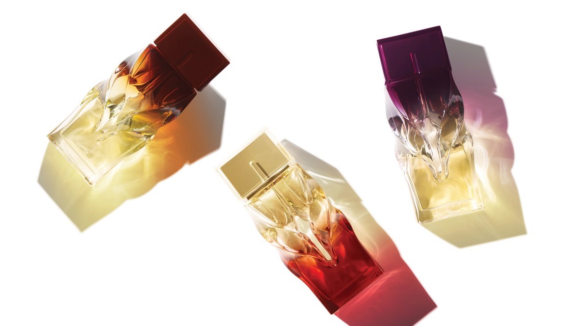 Os frascos de perfume, com vidro ondulado em tons de dourado, vermelho e roxo, e com uma abertura no meio a fazer lembrar um salto de sapato, foram desenhados por Thomas Heatherwick.