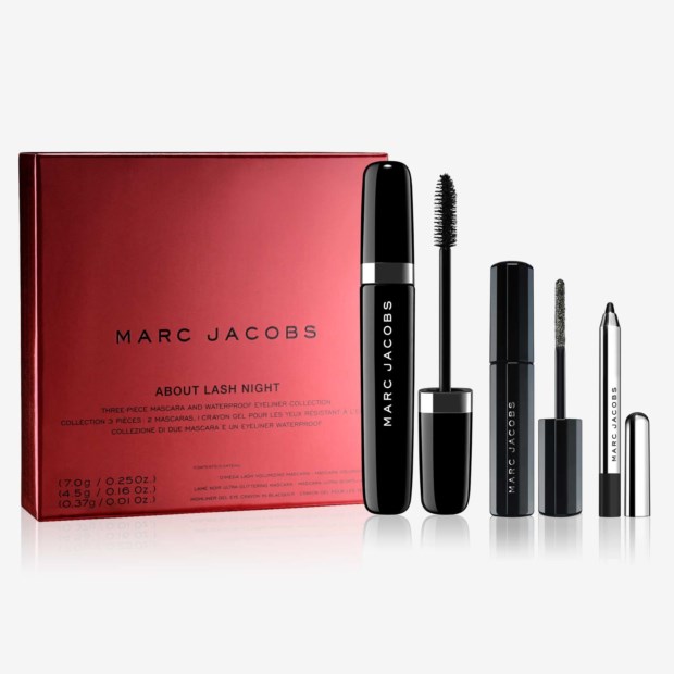- Conjunto "About Lash Night" com máscara de pestanas Volume O!Mega Lash Blacquer, uma máscara de top coat Lamé Noir com brilhos dourados e um mini lápis de olhos em gel e à prova de água Highliner Blacquer. Da Marc Jacobs Beauty, em exclusivo na Sephora por 35,90 euros Marc Jacobs Beauty