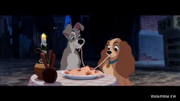 - A clássica cena em que Dama e Vagabundo partilham um prato de esparguete, no filme de animação da Disney de 1955
