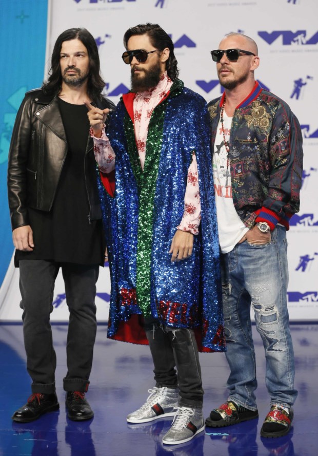 - Jared Leto, em Gucci, e os restantes membros da banda 30 Seconds to Mars Reuters/DANNY MOLOSHOK