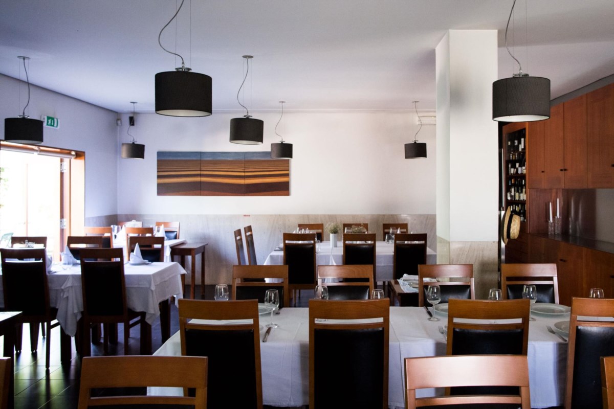 A sala, de tecto alto, decoração funcional e ambiente acolhedor, tem neste tempo de calor o atraente complemento de dois terraços, um traseiro e outro lateral, para repastos mais longos e descontraídos. Baixela aprimorada, toalhas e guardanapos de linho. Sem concessões!