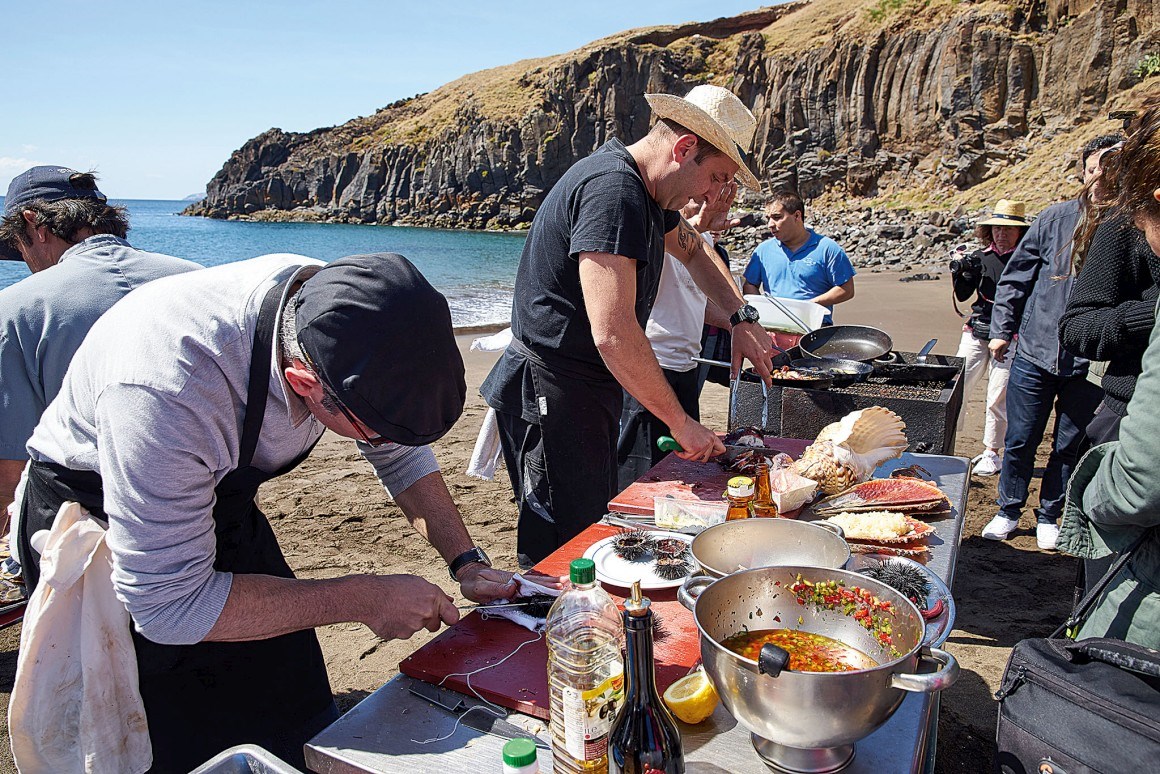 Ainda não é uma hora e Ljubomir Stanisic e Benoît Sinthon põem na grelha peixe acabado de pescar, salteiam lapas apanhadas na hora, abrem ouriços-do-mar que vêm do mar em frente. Depois dos talheres de prata e guardanapos de pano passamos ao pão torrado molhado na frigideira, aos legumes grelhados “caçados” com palito e ao polvo que Ljubomir diz ter inventado ali a partir de uma base de mel. Chega à areia a banda Artistas Funchalenses a animar o ambiente. “Isto é um paraíso para descansar”, explica Benoît Sinthon, que vive na Madeira. “As pessoas dos hotéis também têm que entender que a Madeira é isto: selvagem, rústica. É para mostrar que Madeira é muito natureza”, diz, agora com o som do mar por trás.