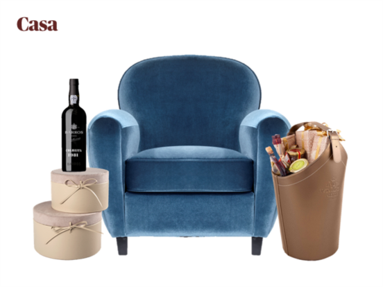 Caixas em pele e camurça Continente €12,99 Vinho do Porto Barros p.s.c. Cadeirão azul Area €238 Cabaz Vista Alegre/Atlantis €150