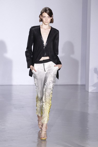 “Quis fazer uma colecção que continuasse o meu trabalho de drapeados e escolhi um tema inspirado na Grécia romântica, mas quis fazer uma abordagem mais tónica, mais colorida”, disse o criador português no final do desfile. Buchinho distribuiu sabiamente o trabalho de drapeados por várias peças, quer em tops quer em vestidos – onde ele é mais usual – mas também em calças e em estampados que jogavam um pouco com os dois universos que inspiraram esta colecção: um estampado que era mais armadura e outro com palmeiras em degradé. E depois o jogo entre elementos mais masculinos, para a parte mais casual da colecção, com outros mais sofisticados onde entram as sedas e os crochets feitos à mão.