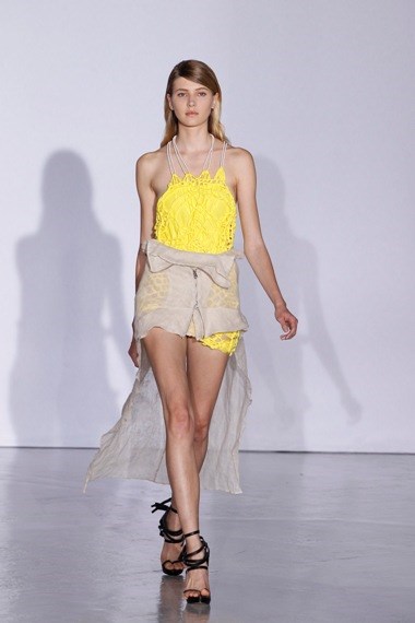 Micro calções de cintura subida conjugados com tops de crochet, que entrelaçam fios de lurex e de algodão, algumas peças com estampados tropicais, outras em tons de amarelo vibrante e muitos drapeados pontuaram a colecção que Luís Buchinho apresentou ontem, no final do dia, nos Espaço Commines, no bairro Le Marais, em Paris.